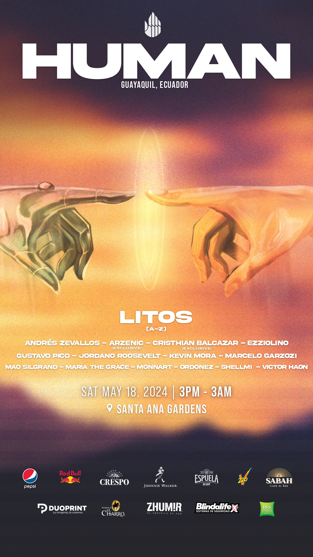 WELCOME TO HUMAN Welcome to this new “Concert Tour” experience. The first edition in Guayaquil, Ecuador, where you can enjoy this epic concert by LITOS alongside 14 incredible national and international artists. Get ready for this 12-hour festival of partying to the rhythm of electronic music. #seeyouontheroad